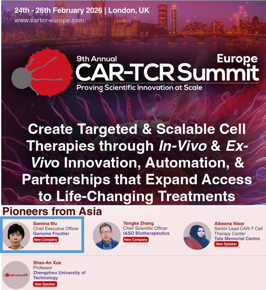 Our Founder/CEO/CSO, Sareina Wu, will present our work as an invited speaker at the 9th Annual CAR-TCR Summit Europe in London, UK. (February 24-26, 2026)